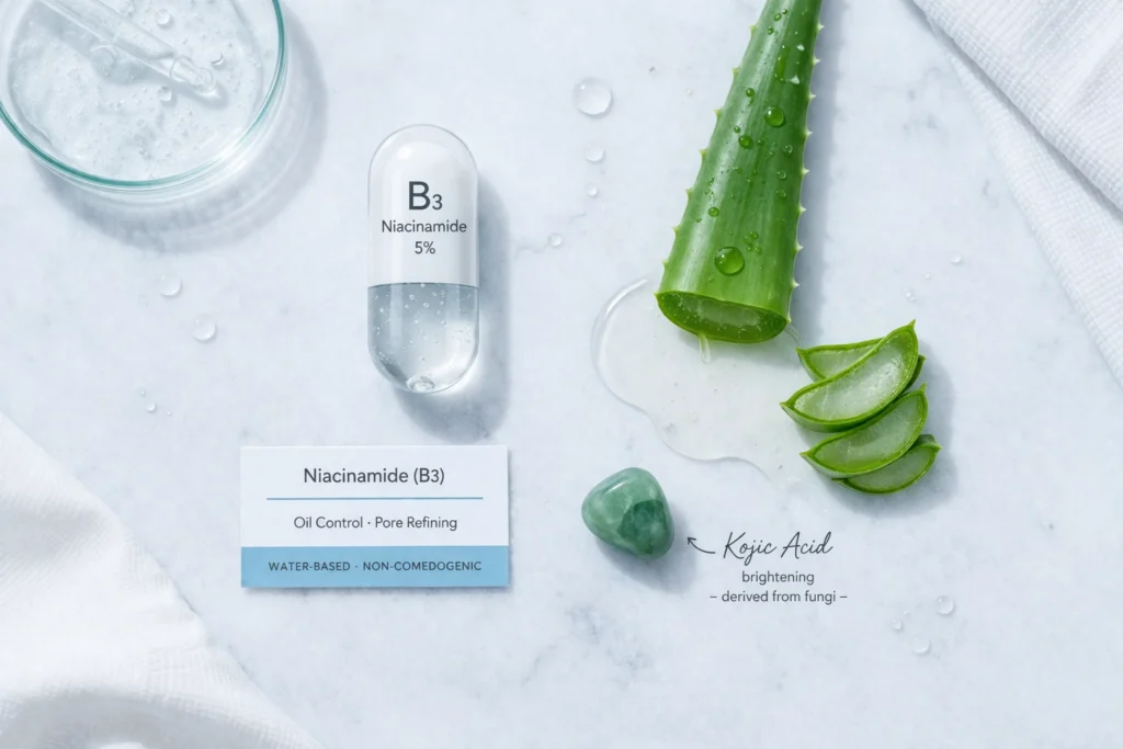 - Niacinamide: A water-soluble, non-greasy vitamin B3 active that clinical evidence shows actually reduces sebum production over 4 weeks of consistent use.