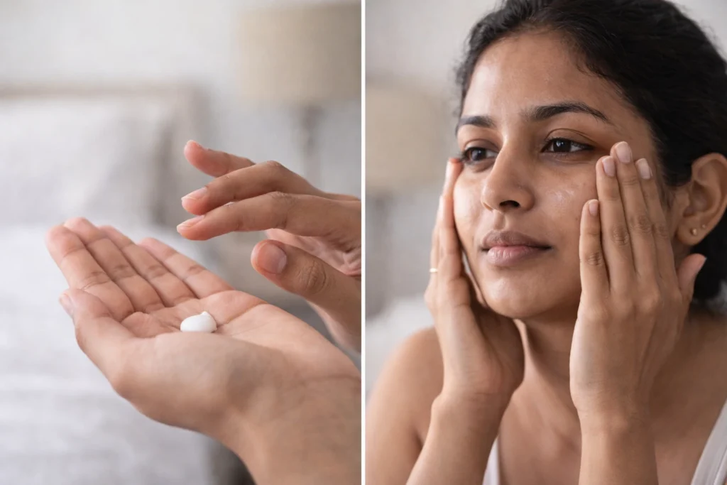For oily skin, the dosing rule is absolute: pea-sized maximum. A rice-grain amount is sufficient for many oily skin types. Excess product does not penetrate further — it sits on the surface, creates the heavy, occlusive feeling that clogs pores overnight, and causes exactly the congestion that oily skin users are trying to avoid. Apply within 60 seconds of cleansing, on skin that is still slightly damp. Press gently into the skin with your fingertips — do not rub or drag. Dragging triggers micro-friction that causes PIH on Indian oily skin.