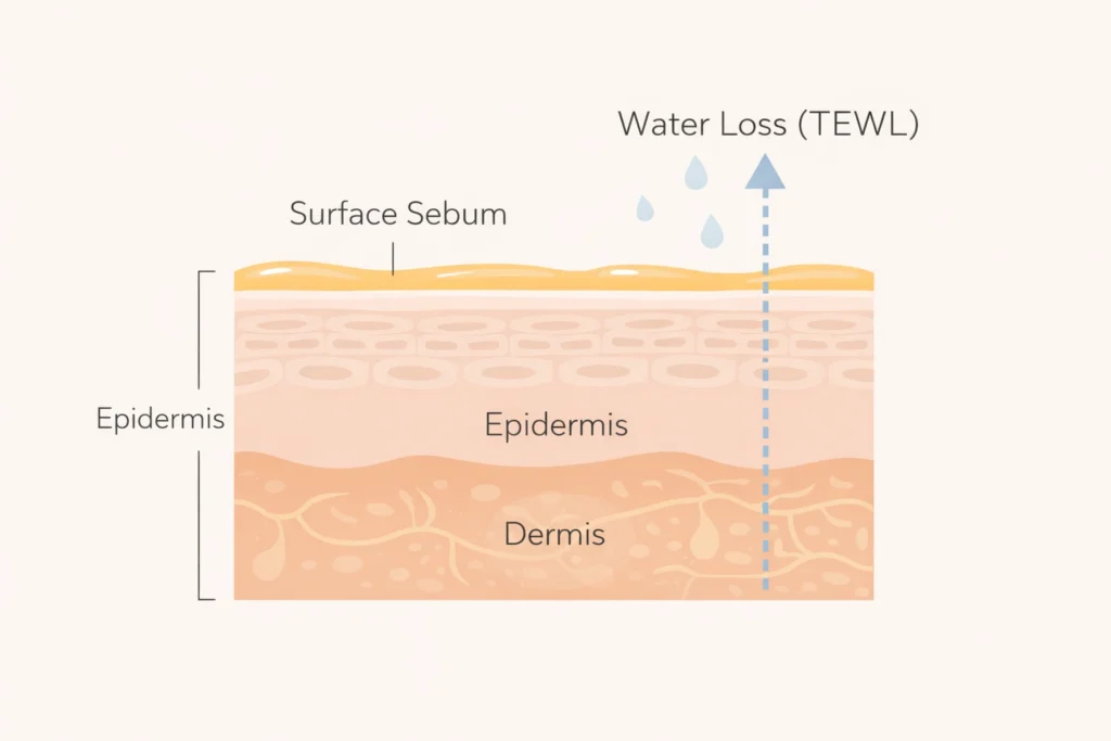 Here is the distinction that explains everything: sebum — the oil your skin produces — sits on the surface. It does not hydrate the skin from within. Hydration comes from water content in the deeper layers of the epidermis. Transepidermal water loss (TEWL) is the rate at which water escapes from these deeper layers through the skin surface into the surrounding air. And TEWL happens in oily skin at night at essentially the same rate as any other skin type.